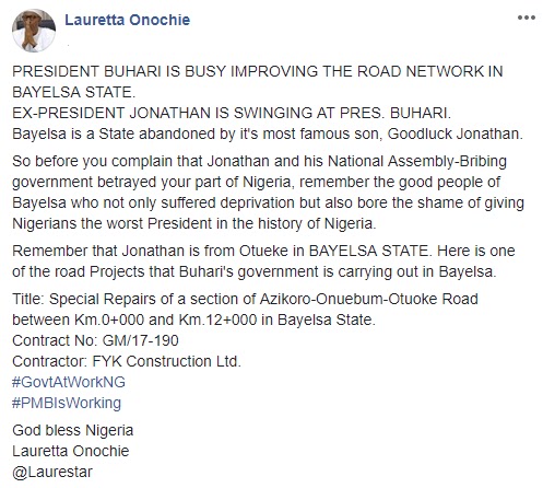 “President Buhari is busy improving the road network in Bayelsa State” says Lauretta Onochie as she fires at GEJ