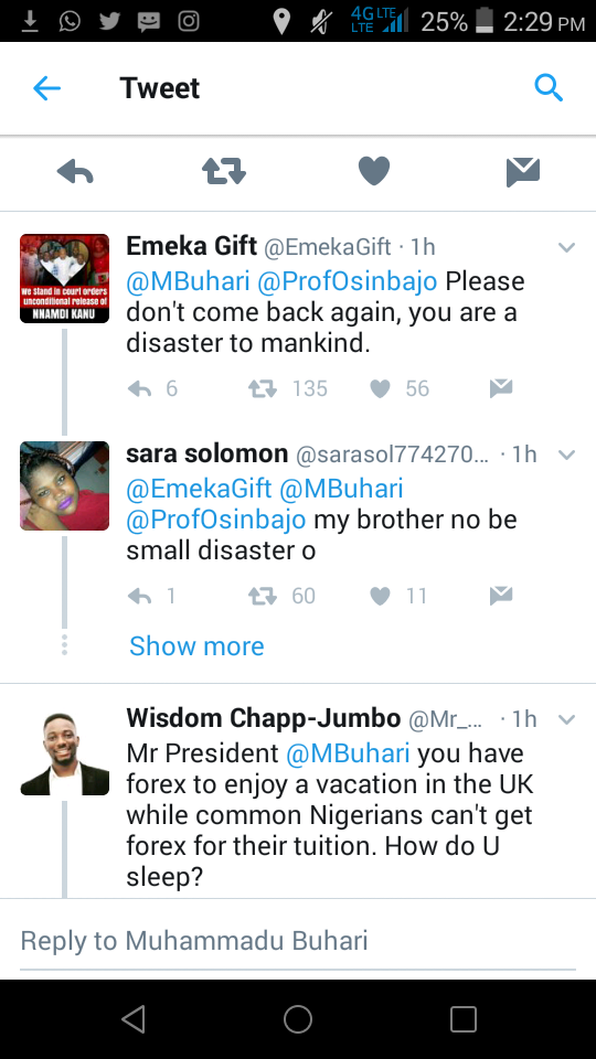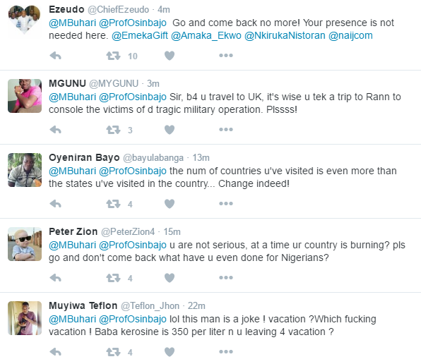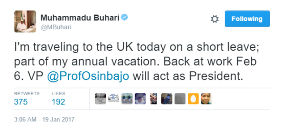 Read reactions of Nigerians on Twitter as Buhari disclosed his vacation abroadBy admin / January 19, 2017 Share thisFacebookXEmailWhatsApp This morning the president of Nigeria on his Twitter account disclosed that he is going on a vacation to return February Nigerians made some funny comments. Read the comments below…
