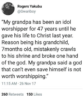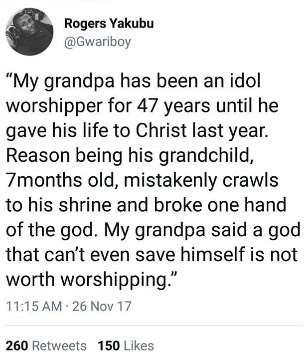 A young man called Rogers Yakubu, shared on Twitter the reason his grandfather gave for converting to Christianity. The old man has been an idol worshipper for the past 47 years.