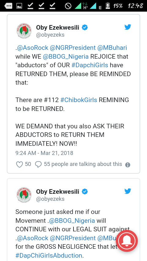 ‘#DapchiGirls returned! What a Testimony! Boko Haram took and Boko Haram returned! For the parents, we thank GOD! For FG, this miracle must be deeply analyzed to replicate it for#ChibokGirls and other issues plaguing our country!’.