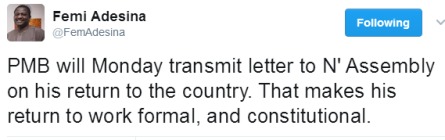 He said he thank the country and all religions including Christians and Muslims for praying for him. He said he has never been so sick as some people were saying.He also said public officials shouldn’t bother coming to pay courtesy visit instead they should focus on their good works. Senior Special Assistant to President Buhari on Media and Publicity, Femi Adesina, says President Buhari will on Monday write to the National Assembly to notify them of his return to the country. According to Adesina, this will make his return to work formal and constitutional. Femi Adesina and all other government officials were overwhelm the president arrival. Buhari further stated that Nigeria has alot to do to meet up with the rest of the world.