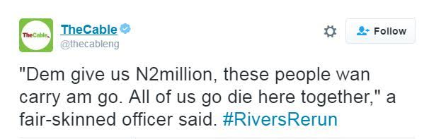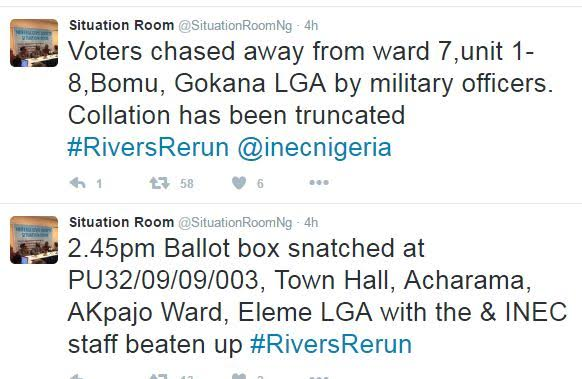 Rivers election full of gun shots…By admin / December 11, 2016 Share thisFacebookXEmailWhatsApp See tweets telling how rough rivers election was… Read tweets