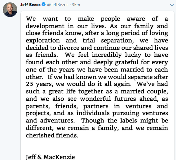 Bezos said the divorce is amicable and they are grateful for the years they have been married to each other. He said they will remain a family and stay “cherished friends”.