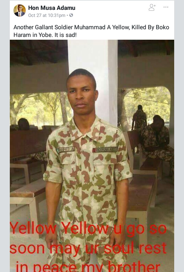 Its so sad that a very young gallant soldier identified as Muhammad A Yellow was among eight soldiers killed suspected Boko Haram insurgents in attack on Sassawa village, Damaturu Local Government Area of Yobe State last Tuesday.