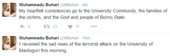 See Buhari’s reaction concerning the earlier bomb blast in University of MaiduguriBy admin / January 16, 2017 Share thisFacebookXEmailWhatsApp President Buhari has reacted to the Bomb blast in University of Abuja, see his tweet below…