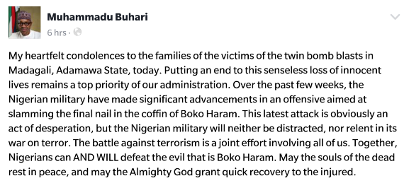 See what Buhari said concerning Adamawa Bomb blastBy admin / December 10, 2016 Share thisFacebookXEmailWhatsApp Reports got to us that about 30 died in Adamawa bomb blast