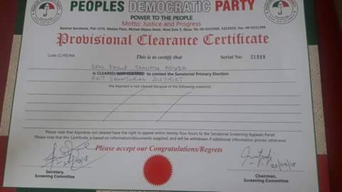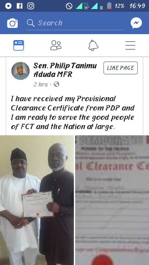The senator representing FCT, Senator Philip Aduda today on his Facebook Page told the public that he received his provisional Clearance Certificate from people’s Democratic Party (PDP).