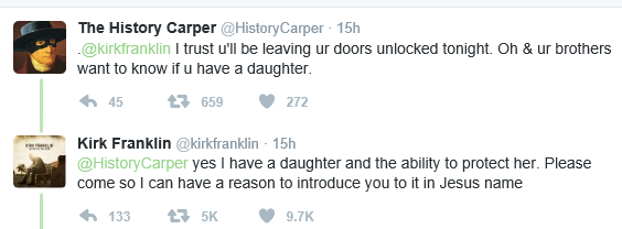 Following US President, Donald Trump’s temporary ban on seven Muslim countries, gospel singer, Kirk Franklin took to his twitter page to voice his displeasure with the above tweet. A troll decided to be disrespectful telling him to leave his door unlocked and insinuated that his daughter would be hurt the refugees. Kirk wasn’t here for that and gave him an epic clapback! Read the tweet below….