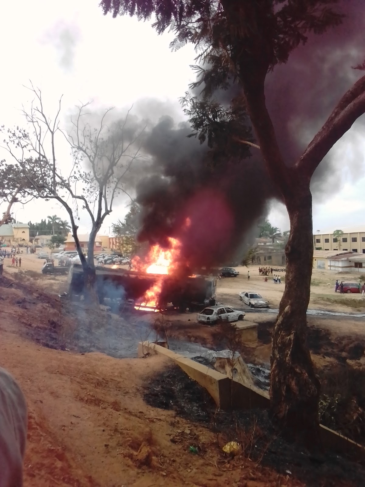 Reports have it that no life was lost and only 3 cars were burnt along side the tanker.