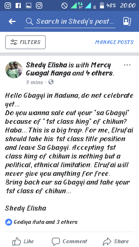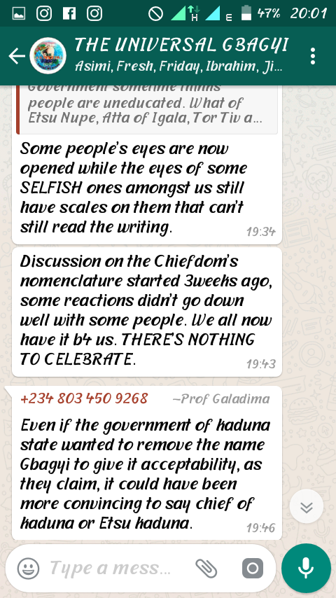 Today again in the press release that announced the promotion of Sa Gbagyi to first class king, it was stated that the Sa Gbagyi will now be addressed as Chief of Chikun and this has caused reactions from the people of Gbagyi and the general public. The Gbagyi nations have shown disapproval to the change of nomenclature of the Gbagyi chiefdom and the ruler. See the different reactions below: