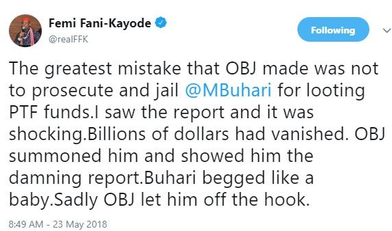 ‘The greatest mistake that Obasanjo made was not to prosecute and jail President Buhari for looting PTF funds’ – FFKBy admin / May 23, 2018 Share thisFacebookXEmailWhatsApp