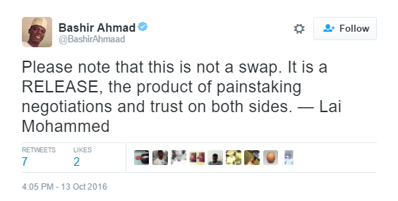 The rescue of the chibok girls is not a swap game says FGBy admin / October 13, 2016 Share thisFacebookXEmailWhatsAppSEE WHAT THE SUSPENDED LAW MAKER JIBRIN SAID ON TWITTER ABOUT THE 21 RELEASED CHIBOK GIRLS, COULD IT BE BRIBE? LAI MUHAMMAD SAID THE RELEASE OF THE 21 CHIBOK GIRLS IS NOT A SWAP BUT A RESCUE MISSION