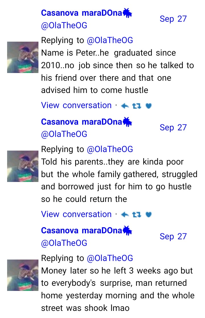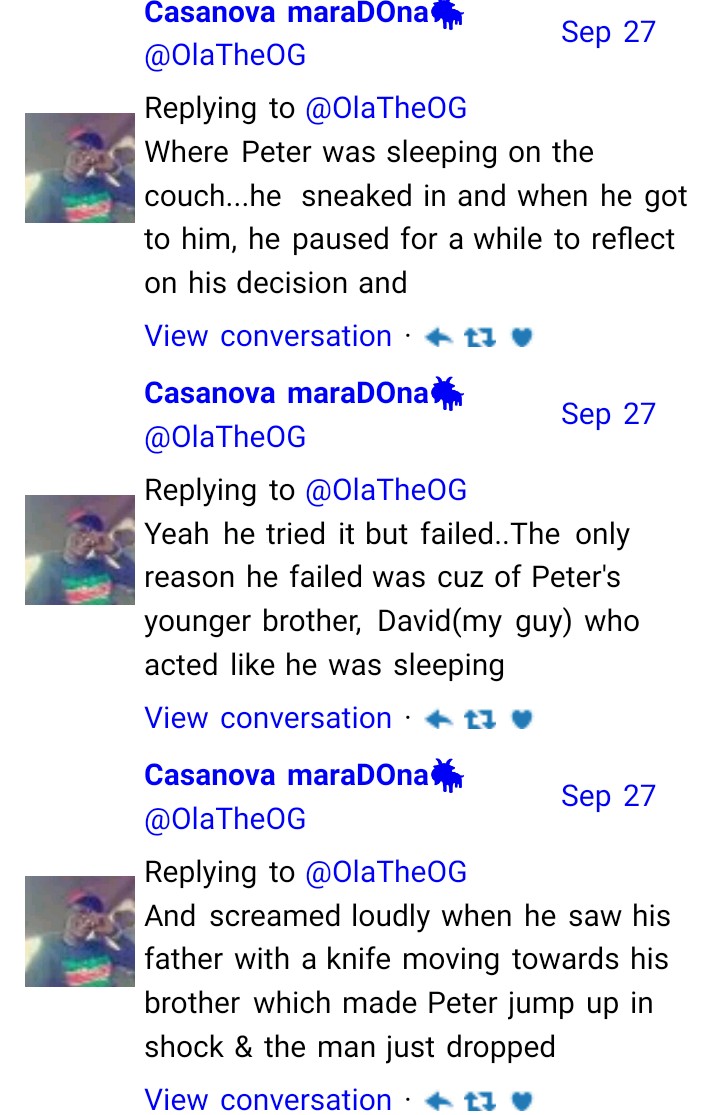 A Twitter user has narrated how a man almost stabbed his son in his sleep after they borrowed money to send him to Finland and he returned three weeks later because he couldn’t stand the cold in Finland. Read the tweets below…