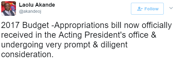 twitter handle yesterday to say Osinbajo would assent to the budget when