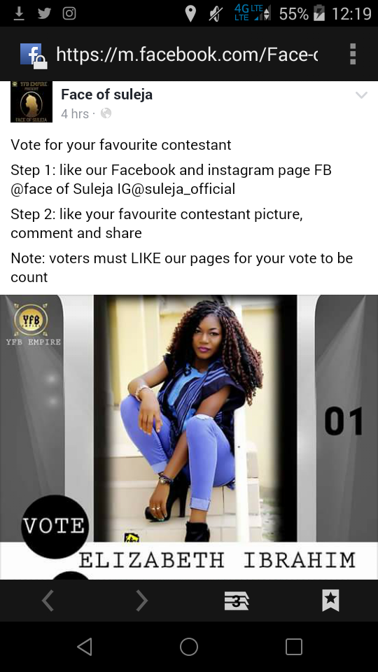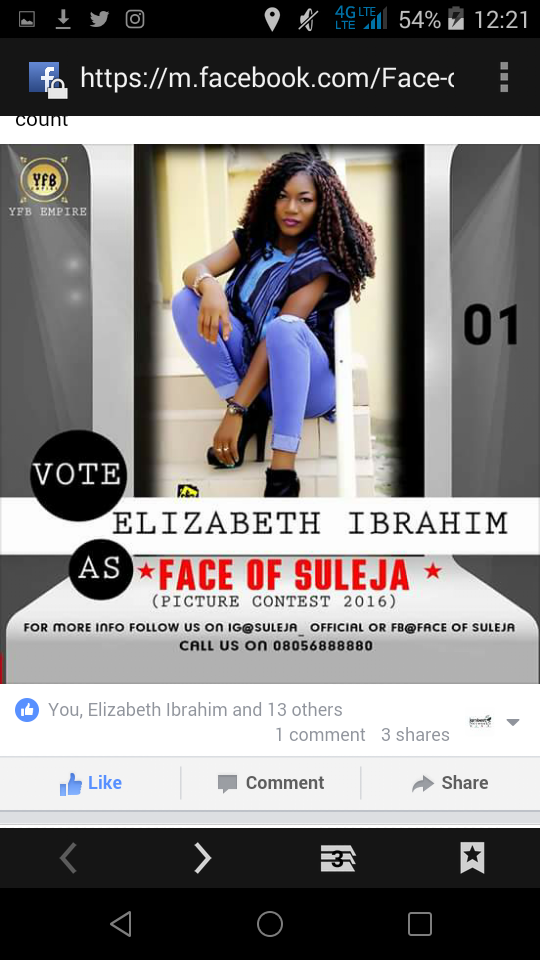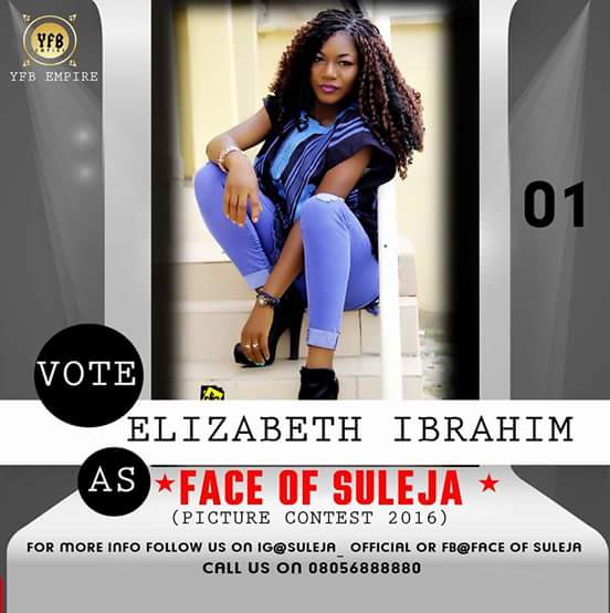 Elizabeth Ibrahim is contesting for Face of Suleja. She worth it. She is just the best for it. Distance is not a barrier whether you are in London, Jamaica, Ghana or Nigeria you can still vote.   Vote for her and you will be happy you did. She is contestant number 1