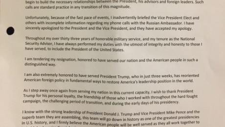 “I inadvertently briefed the Vice President-elect and others with incomplete information regarding my phone calls with the Russian ambassador. I have sincerely apologized to the President and the Vice President, and they have accepted my apology,” Flynn wrote, according to acopy of his resignation letter obtained CNN.