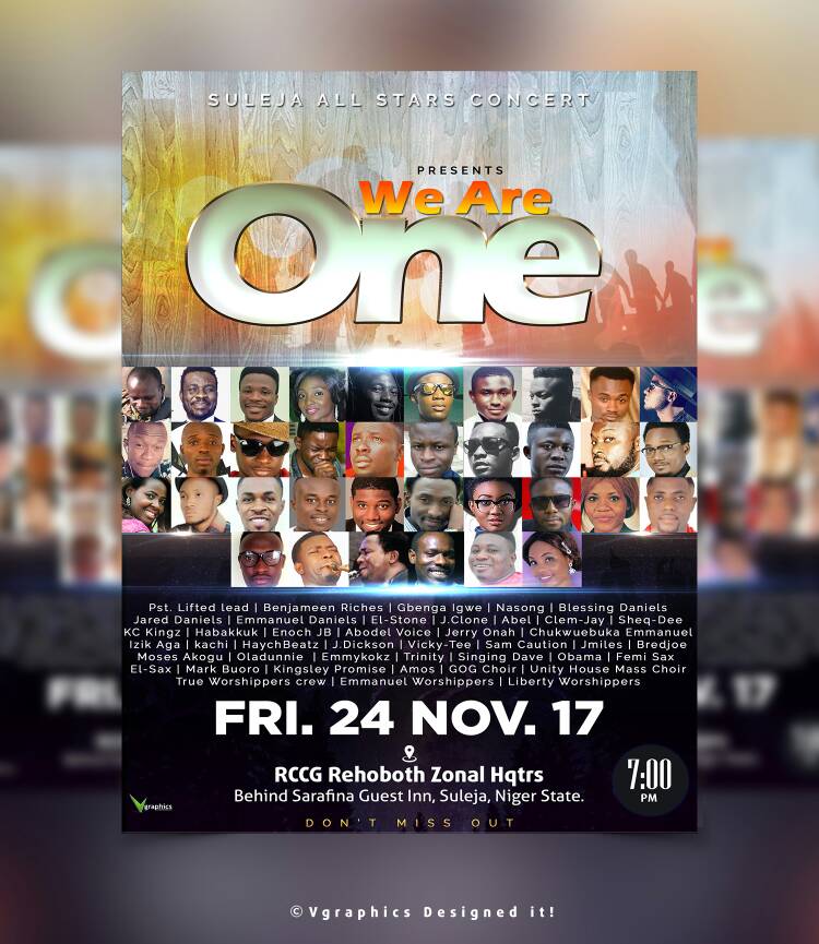 We are one concert is a must attend concert that is aimed at glorifying the name of The Lord with all styles of music and also uniting all Suleja music ministers and thus, your favourite gospel music ministers will be live on stage. The whole of Suleja and Abuja will definitely feel the heat of this event as it plans to be a hit and will be the most talked about gospel music concert in Nigeria as a whole so be there. Don’t be told about it.
