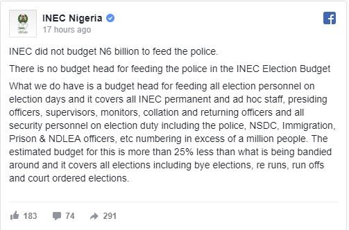 Independent National Electoral Commission, (INEC) has reacted to reports that N6bn was budgeted for Police feeding in the 2019 general elections.