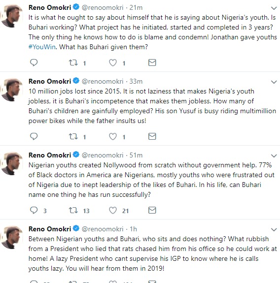 ”Your son Yusuf is busy riding multimillion power bikes while you insult Nigerian youths” Reno Omokri trolls President Buhari over his comment at CHOGMBy admin / April 19, 2018 Share thisFacebookXEmailWhatsApp As shared Reno Omokri on his Twitter handle